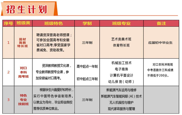 学校秉承”以人为本、因材施教”的理念,高度重视学生及家长的意愿,结合学生的兴趣特长与发展潜力,量身定制个性化培养方案供学生选择,助力学生自主成长。学校先后荣获“安徽省德育工作先进集体”"安徽省未成年人思想道德建设示范校”"安徽省质量提升工程项目合格学校”"安庆市平安校园”等荣誉。学校全面推行规范(准军事化)管理坚持探索职普融通发展之路,大力创建特色品牌,是一所办学方向明确、办学实力雄厚、办学成果丰硕的全日制中等专业学校。
